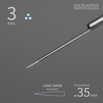 Our Round Liner Needles have a nice comfortable solder distance; Not too tight but not too loose, just right. They are made with long taper pins.